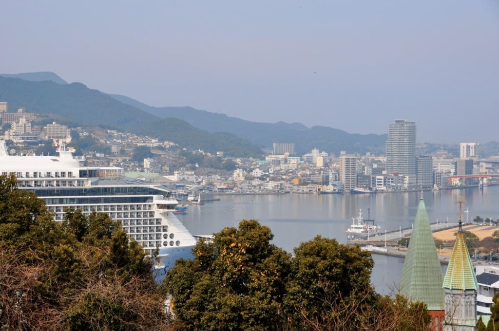 異国情緒あふれる洋館が立ち並ぶグラバー園からは、長崎港を行き交う船舶や豪華客船スペクトラム・オブ・ザ・シーズを背景に、歴史ある街並みとのコントラストを楽しむことができます。